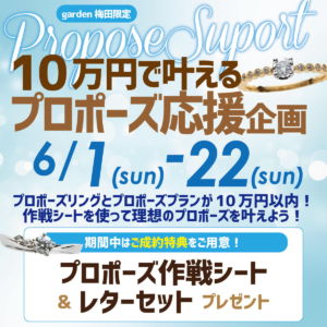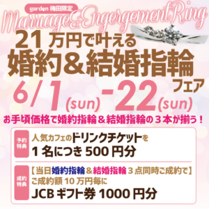 garden(ガーデン)梅田は、関西大阪最大級の婚約指輪結婚指輪を取り扱うジュエリーショップです。大阪でプロポーズをご検討の方もご相談ください!