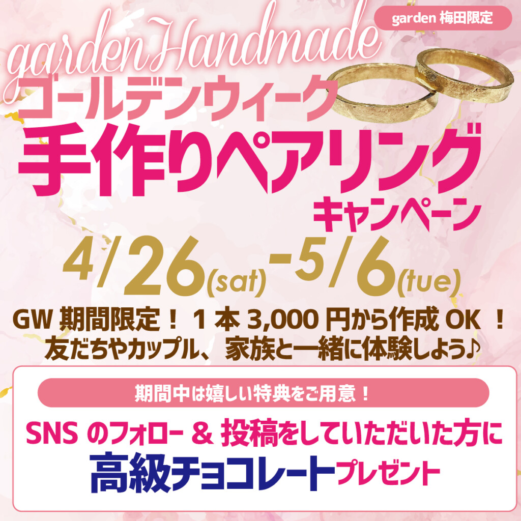 garden梅田で大人気の【手作りペアリング】。期間中はオリジナルリングケースをプレゼント♪クリスマスシーズンなのでカップルはもちろん、冬休みの思い出にご友人同士や家族との体験ももちろんOKです!スタッフがサポート致しますので是非一緒にペアリング作りを体験してみよう!