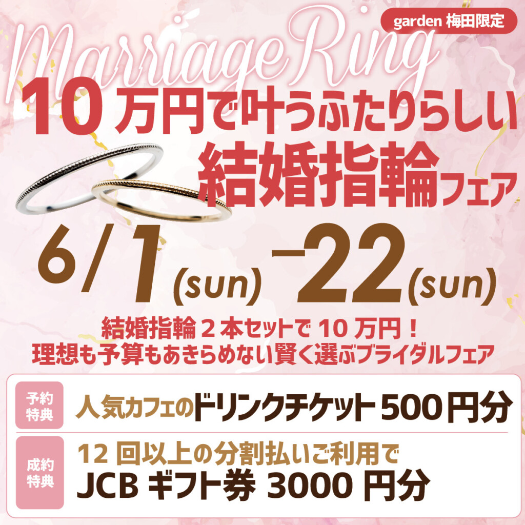 関西最大級・90ブランド以上のの品揃えを誇るgarden梅田では10万円以内の結婚指輪も多数取り揃えております!またお支払は分割払いも可能◎結婚指輪を購入するなら是非お得なこのタイミングがおすすめです。