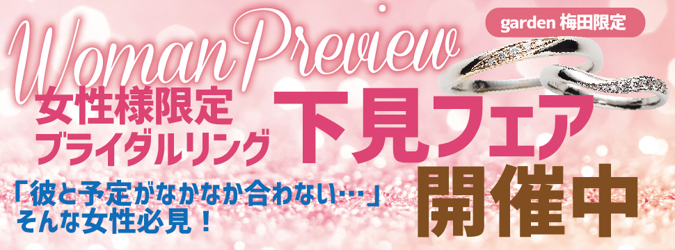 - 「彼と予定が中々合わない…」「悩んでしまうから先に絞っておきたい...」という女性様必見!garden梅田では常時90ブランド以上取り揃えておりますので一度に沢山着け比べが可能です。関西最大級のブランド取り扱い数のあるgarden梅田で指輪の見比べ着け比べはもちろん5/31までの限定特典も◎