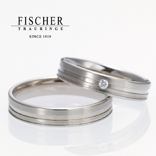 平打ちのフォルムにラインを二本入れたシンプルなデザインの結婚指輪です。FISCHERの指輪の中でも厚みの薄いシリーズで、指にはめて頂くと隣の指に全く干渉せず、指輪を着けていることさえも忘れてしまうほどの着け心地の良さが一番の特徴です。また、4mm幅ということで少しだけ幅のあるデザインですが、二本のラインを中心に入れるのでなく、あえて下側に片寄せたことにより、全体的に少しすっきりして見えて、女性でも幅をあまり気にせずにお使いいただける結婚指輪です。ラインは機械で入れるのでなく一本一本、マイスターの手作業で入れています。その辺がFISCHERの手作業へのこだわりをよく感じれる指輪です。