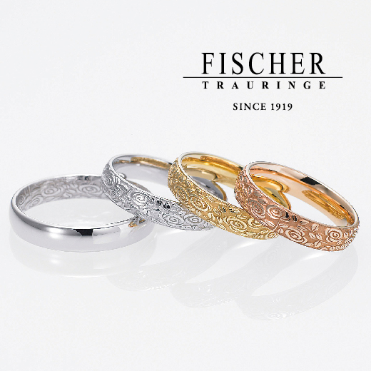 全面にバラの刻印が施された、少し個性的ながらも丸みのある彫りで優しいイメージの暖かみを感じる結婚指輪です。男性側は、表部分に彫りを入れてしまうと着けにくくなってしまうので指輪の内側に刻印しています。彫りはすべてレーザーで刻印れています。手彫りの雰囲気とは少しちがい、手作業の場合はすこし粗目な彫りが味があっていいのですが、レーザーで掘られた場合の機械らしい寸分の狂いもない精巧な彫りも非常に美しく、魅力的です。他社でここまで精巧にバラのデザインを掘りあげている指輪はなく、FISCHERが保有している工業用のレーザー刻印ならではの精巧さです。また、手彫りよりもはっきりと柄がわかりやすいのも特徴で繊細さはあるけれども柄のはっきりする大胆さが特徴でもある結婚指輪です。