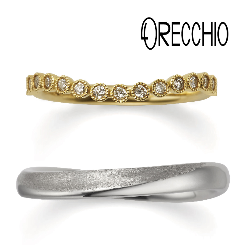 ダイヤモンドを包み込むようなミル打ちが愛らしいエタニティタイプの結婚指輪です。このタイプのデザインは、ストレートのデザインが多いのですがあえてV字にデザインをして。着けたときにお洒落に見えるのはもちろん、指が長く綺麗に見えるようにデザインをされています。そして、シンプルなストレートの婚約指輪にも綺麗に重ねられることがお客様に気に入ってもらえるポイントでもあります。可愛いけど、ORECCHIOらしい子供すぎない大人可愛い結婚指輪です。
