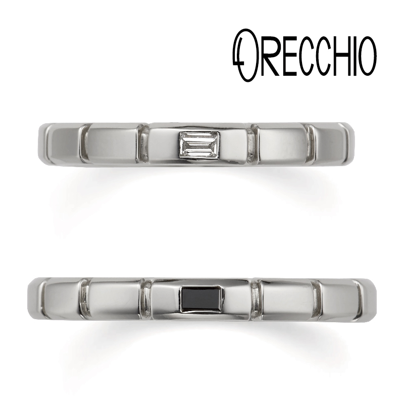 バゲットカットダイヤの澄み切った輝きと丸みのあるフォルムが特徴の結婚指輪です。ブロックを作ったようなデザインを入れることにより、重厚感も感じつつ、少しカジュアルにも見えるデザインが特徴です。男女ともに一石だけバケットカットのダイヤモンドをあしらい、結婚指輪特有の高級感もしっかり持たせています。あまり人とは被らないORECCHIOらしい結婚指輪です。