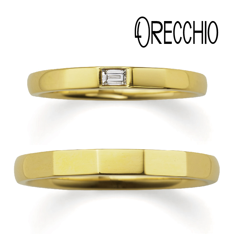 ほどよく角のある細身のデザインにバゲットカットダイヤがアクセントになった結婚指輪です。角がアクセントではあるのですが、あまり角を強くたたせてしまうと女性らしく見えなくなってしまうので、女性側は丸みを持たせて、少し角があるかな??というくらいで、角があっても女性らしい可愛くもありながら優しさを感じるデザインです。逆に男性側には、女性側より角をたたせて、男性らしいカッコいい男らしさを感じるデザインにしています。日本ともORECCHIOらしい個性をしっかり感じる作品です。